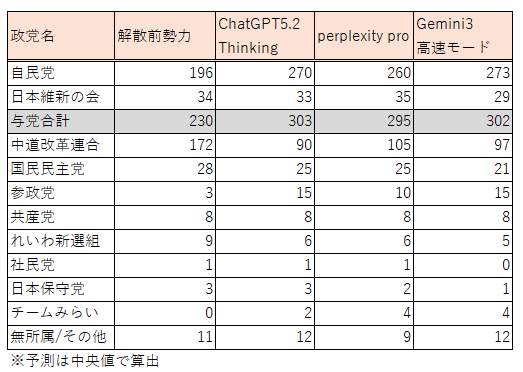生成AI御三家に本日午前10時40分に2026年の衆議院議員選挙・政党別予測議席数を出させてみました。